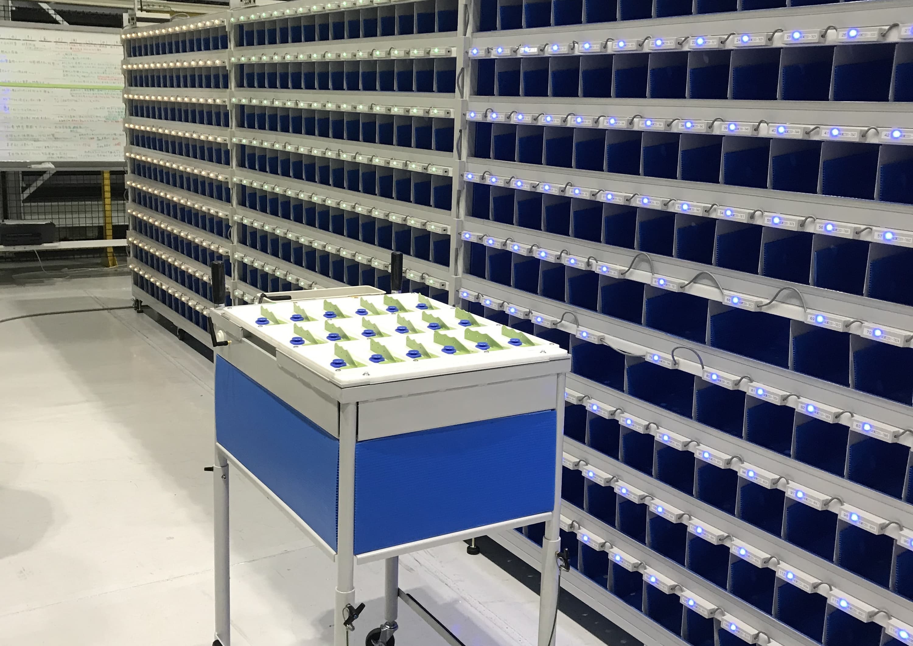 ■出庫作業時の間違い及び無駄な動きの削減 出庫すべき棚間口が点灯し、専用のパレット台車を用いて出庫を行うため、パレット上に正しきキットすることができます。また、棚間口の情報をもとに自動的に一筆書きの流れでキットすることができるため無駄な動きを削減することができます。 |